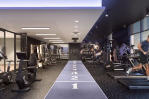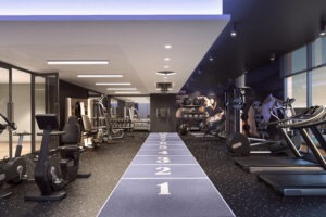 Fitness studio with pool views